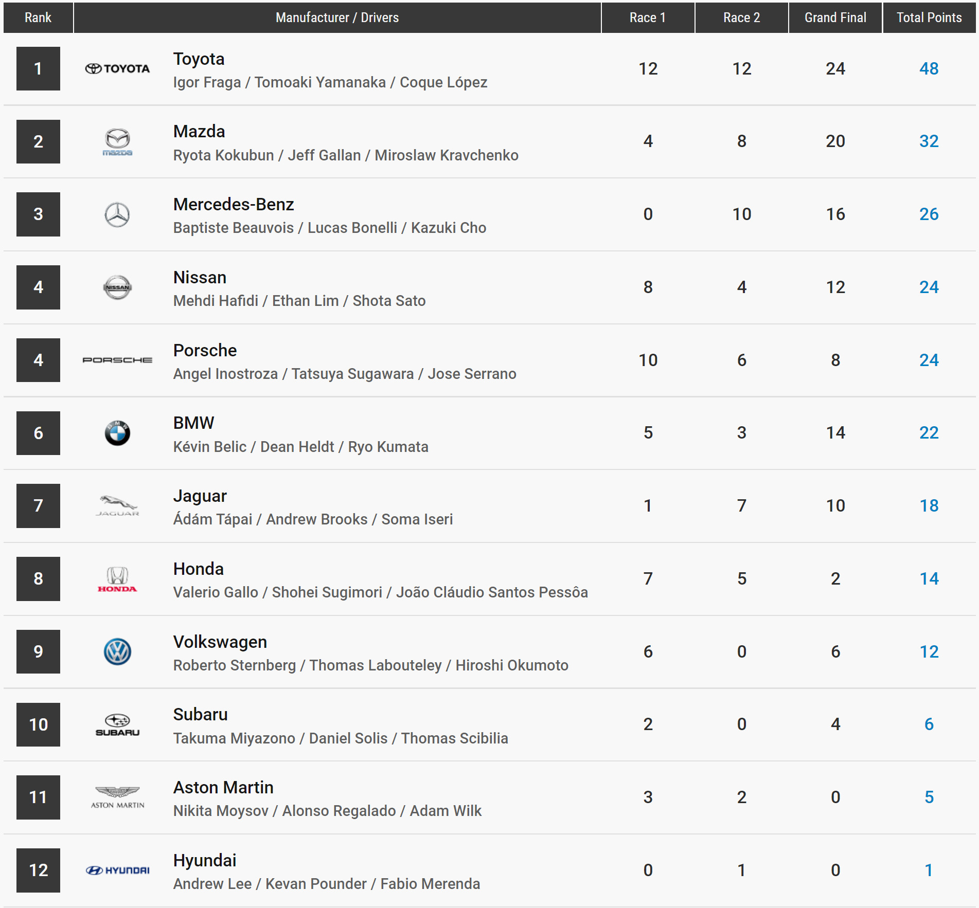 A hétvégi finálé magyar érdekeltségű programját Tápai nyitotta meg a Jaguár gyári pilótájaként, ahol is a japán Soma Iseri és a kanadai Andrew Brooks voltak a márkatársai. A három futamból álló döntő nem indult túlságosan jól Jaguár szempontból, ugyanis Iseri nem ment jól a Lago Maggiore – GP II-es pályán és így a 10. helyen végezve csupán 1 pontot szerzett az első fordulóban. A második futamban a kanadai Brooks következett, aki viszont nagyon imponáló versenyzést bemutatva egészen a negyedik helyig jött fel a Tokyo Expressway – East Outer Loop-on megrendezett városi pályán. Ezzel a kanadai klasszis pilóta életben tartotta a márka, dobogós esélyeit. A mindent eldöntő harmadik – duplapontot érő – Nürburgring 24 nyomvonalon rendezett futamon érkezett Tápai Ádám, aki egy kiváló időmérőt teljesítve a 4. helyről várta a rajtot. A lámpák kialvása után azonnal szorongatni kezdte a francia Beauvois-t és a stadion résznél külső íven majdnem előznie is sikerült. Ezután a szélárnyékból való lemaradása miatt folyamatosan leszakadt az élen álló három versenyzőtől, és a futam derekán már a mögötte érkező Belic, majd Hafidi is megelőzte a szemmel láthatóan tempóhátrányban köröző Jaguár pilótát. Az utolsó kör is tartogatott izgalmat, hiszen Tápait a chilei Inostroza is utolérte a Porsche-val és a pálya középső szekciójában meg is előzte. Tápai megpróbált tapadni, de a Jaguárban nem volt több ezen az estén, mint amit a magyar kiautózott belőle. A futam leintése előtt a chilei egy időbüntetést kapott, amivel Tápai visszavette a nemsokkal korábban elvesztett pozíciót, és a 6. helyen zárta a kaotikus futamot. A Toyota szerezte meg a gyártói VB. címet, a Jaguár pedig 7. helyen zárta a küzdelmeket.