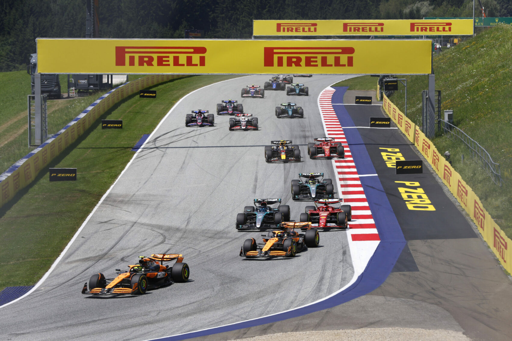 Amikor az Osztrák Nagydíj 64. körében Norris a 3-as kanyar külső ívén próbálkozott be Verstappennel szemben, a holland fékezés közben irányt váltva szorította egyre kijjebb a britet. Ez végül mindkettőjüknek defektet okozó ütközésben csúcsosodott ki, ami miatt a hollandra szabtak ki 10 másodperces időbüntetést a felügyelők.