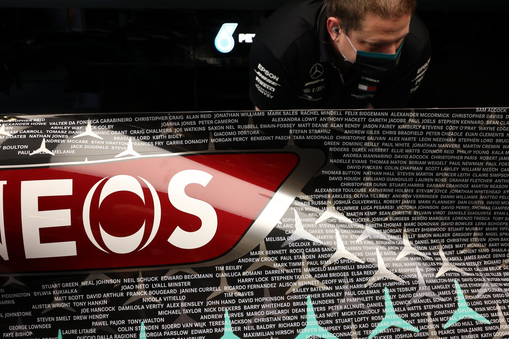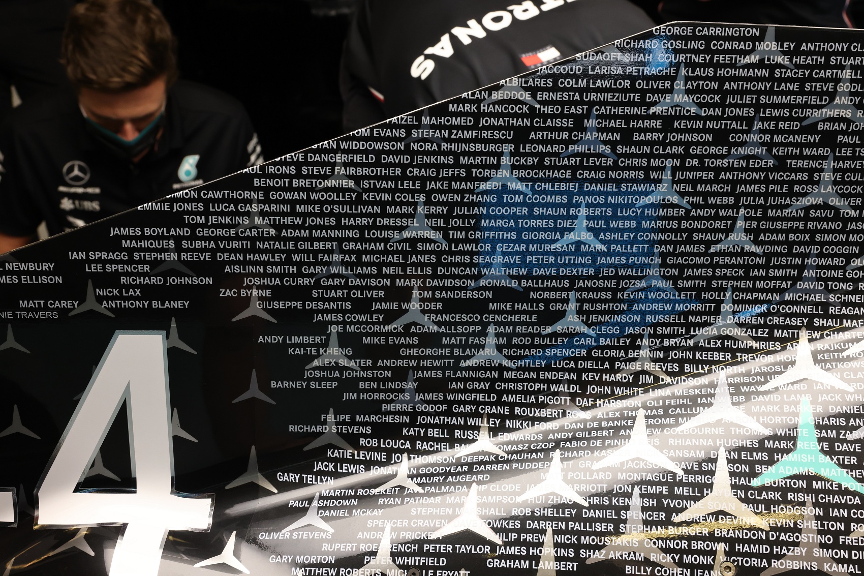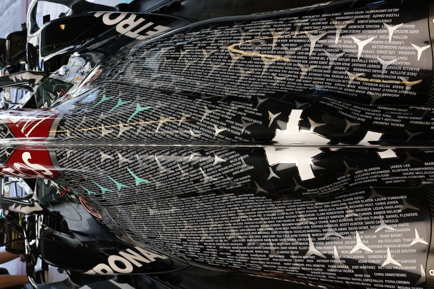 A nevek fehérrel kiemelve láthatóak a szokásos csillagok mögött. Toto Wolff még azt is hozzátette, hogy hét csillag a „Petronas zöld” színt vette fel. A Mercedes ezt a különleges ajándékot, csak az időmérőn és a futamon fogja használni.