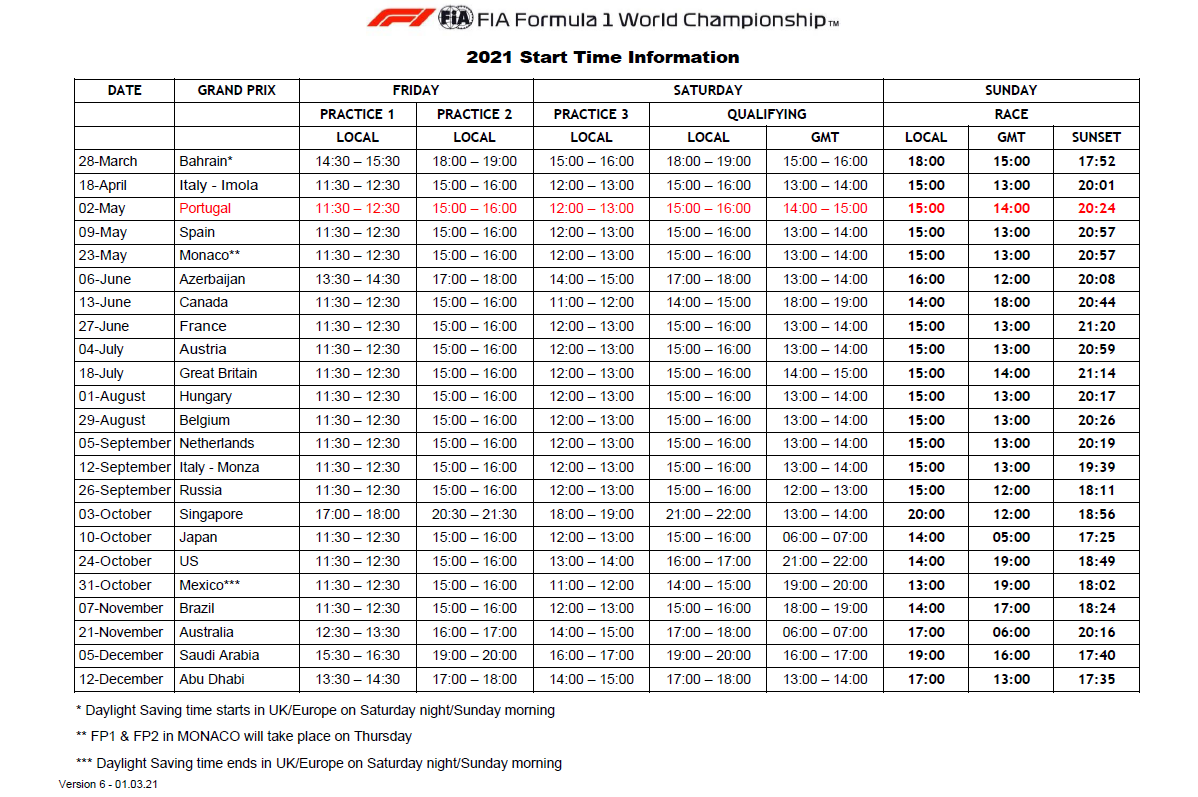 Az FIA közölte a 2021-es F1-es szezon versenyhétvégéinek menetrendjét, az edzések és versenyek kezdési időpontjait az egyes helyszíneken.