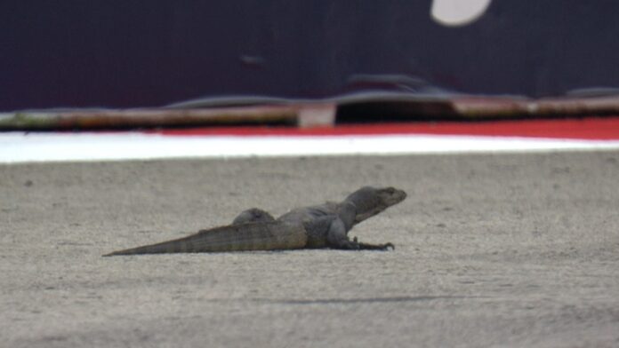A gyakorlás első tíz percében még csak a két Aston Martin tartózkodott a pályán, amikor azon megjelent a korábbi szingapúri F1-es hétvégéken hírnevüket már kiépítő varánuszok egyike. A méretes hüllő az aszfalt közepén vándorolt, s hamarosan kiharcolta az edzés piros zászlóval való leállítását is. Ekkor két sportbíró – az egyikük egy nejlonzsákkal – az állat becserkészésére indult, erre azonban az ijedt varánusz mindenki nagy meglepetésére olyannyira szaporázni kezdte a lépteit, hogy a tempóját tartani is nehéznek bizonyult, ami általános mosolygást váltott ki a garázsokban és a lelátókon figyelőkből.