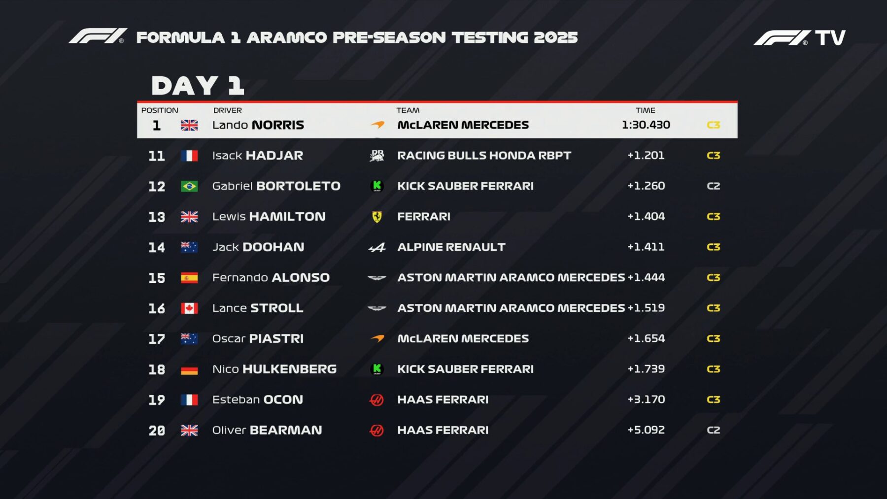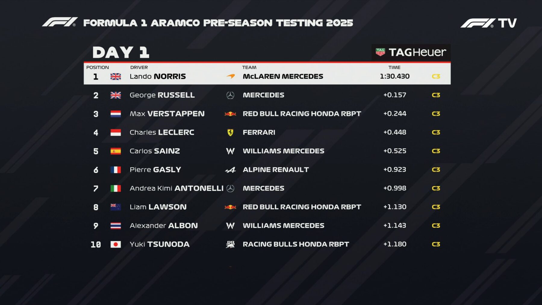 A délutáni felvonásra teljes sorcserét láthattunk, az összes csapat lecserélte ugyanis a versenyzőjét, így a Ferrariba Leclerc, a McLarenbe Norris, a Mercedesbe Russell, a Red Bullba Verstappen, a Racing Bullsba Hadjar, az Aston Martinba Alonso, a Haasba Ocon, az Alpine-ba Gasly, a Sauberbe pedig Bortoleto ült be.