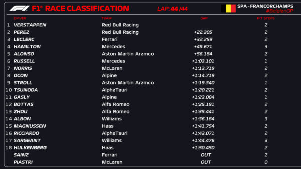 Bár a vártnál talán kicsivel később, de Max Verstappen a rajtbüntetése után is könnyedén vette át a vezetést és nyerte meg a Belga Nagydíjat. Zsinórban nyolcadik futamgyőzelmét a futam közepén Spát elérő enyhébb eső sem veszélyeztette.