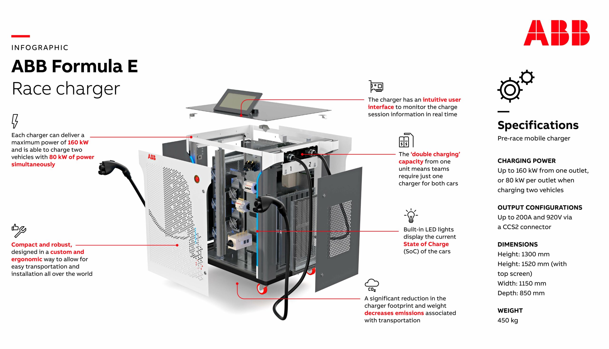 Az ABB Formula-E verseny akkumulátortöltője az ABB legújabb töltéstechnológiáját alkalmazza és a szektorban betöltött vezető szerepére támaszkodik. Kialakítása a személyautók töltési megoldásaiban már bizonyított technológiát veszi át a motorsport nagy igényeket támasztó környezetéhez igazítva. Az állandó teljesítmény mellett a lehető legmagasabb fokú megbízhatóságot nyújtja, bárhol is használják a világon, különböző áramforrásokhoz kapcsolva.