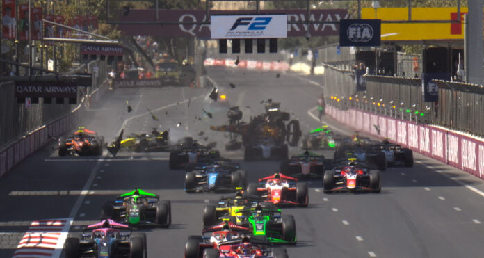 Hatalmas balesettel indult a Forma–2 Azeri Nagydíjának főfutama vasárnap délelőtt, miután Kush Maini autója a rajtrácson ragadt, ketten pedig hátulról eltalálták. Előbb Oliver Goethe csapódott bele Mainiba, majd érkezett a Red Bull-junior Pepe Marti, aki rosszabbul járt Goethénél, hiszen az autója a levegőbe emelkedett, majd egy ideig fejtetőn csúszott, aztán pedig visszafordult. A látványos bukás – amelyet mindhárom versenyző ép bőrrel megúszott –, alább nézhető meg.