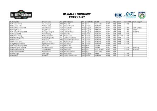 A lista természetesen a bajnokság élén álló Andreas Mikkelsennel kezdődik. Sajnos Alexey Lukyanuk már a Fafe Rallyn bejelentette, hogy elfogyott a büdzséje, emiatt kihagyja a magyar versenyt. A két dobogós helyen álló pilóta, Miko Marczyk és Llarena Efrén azonban itt lesz, és természetesen ők lesznek a legnagyobb ellenfelei Herczig Norbertnek és Ferencz Ramónnak. A Skoda Rally Team Hungaria párosa 4-es rajtszámmal indul, és itthon is az év végi dobogóért harcolnak majd.