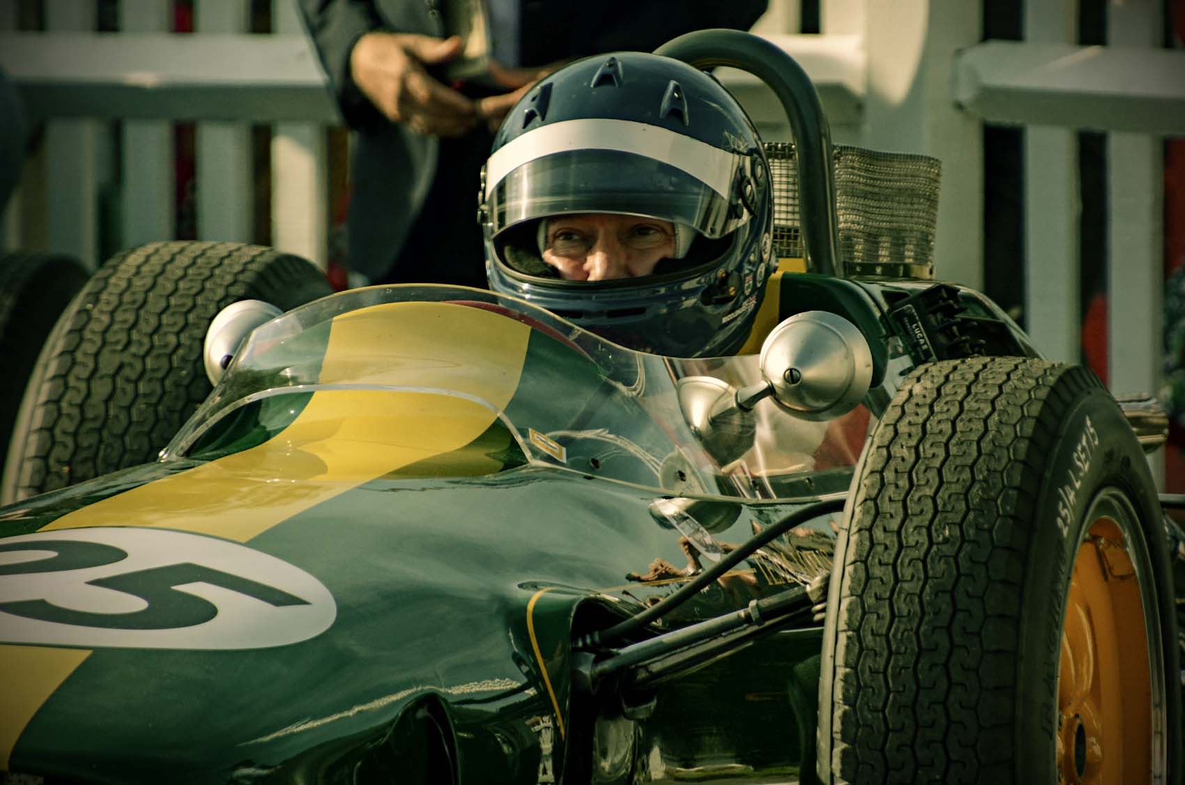 JS: Úgy 1964 elején. 1963-ban az Ecurie Ecosse-nál versenyeztem, még a selymet használtam, de mikor 1964-ben kezdtem a Formula 3-ban, már festett sisakom volt. Ugyanaz a fickó festi a sisakjaimat a mai napig! Doug Err-nek hívják és itt él Goodwood környékén. Már senki másnak nem dolgozik, csak az enyémet készíti!