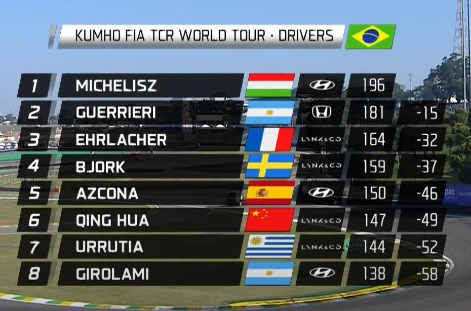 A túraautós elitsorozat a szezonja féltávjához érkezett az év negyedik állomásán, a brazíliai Interlagosban, ami a Forma-1-ből jól ismert, ám az európai túraautósok többsége, így a tabellát 22 ponttal vezető Michelisz sem versenyzett még itt korábban. A mezőnyt ezúttal a TCR dél-amerikai bajnokságának tagjai töltötték fel, s olyan ismerős neveket találhattunk közöttük, mint a 2008-as Szingapúri Nagydíj ütközésbotrányában aktív szerepet játszó Nelson Piquet Jr., vagy a most 49 éves Norberto Fontana, aki 1997-ben négy F1-es futamon rajthoz állt a Sauberrel.